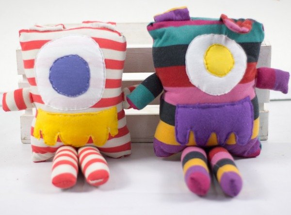 Confeccionados en jersey o modal, tienen un bolsillo en la parte posterior que sirve como porta-pijama en casos de niños pequeños o como simple elemento de juego. Tienen cascabel al interior y relleno de vellón siliconado.